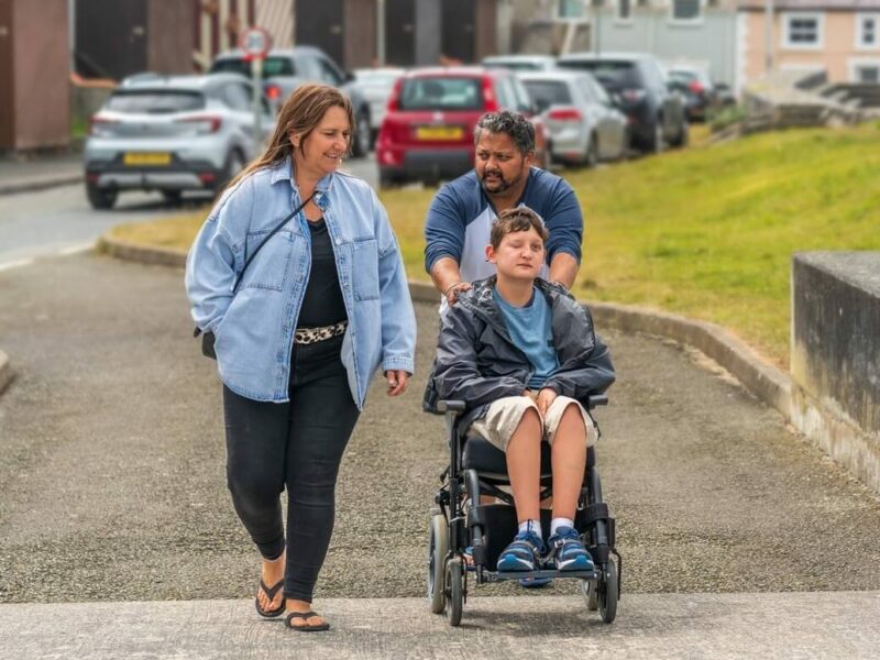 A boy in a wheelchair plays in the garden with his mum.