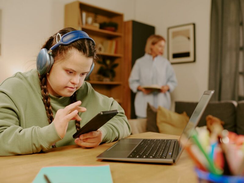 A smiling woman holding brightly coloured pencils sits next to a laughing young child wearing headphones in front of a laptop.